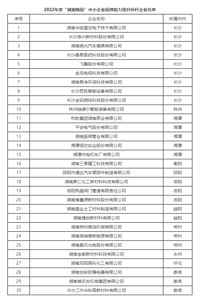 根據(jù)《“湖湘精品”中小企業(yè)品牌能力提升三年行動計劃(2021-2023年)》和《關(guān)于征集2022年度“湖湘精品”中小企業(yè)品牌能力提升標桿企業(yè)的通知》要求,經(jīng)試點企業(yè)申報、市州工信局推薦、專家評審及公示等程序,省工信廳遴選出30家企業(yè)為2022年度“湖湘精品”中小企業(yè)品牌能力提升標桿企業(yè),現(xiàn)予公布。
