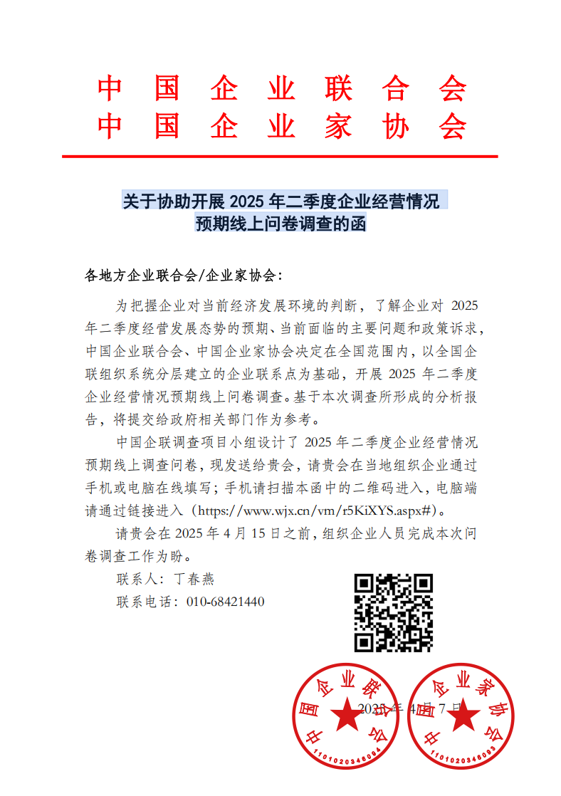關(guān)于協(xié)助開(kāi)展2025年二季度企業(yè)經(jīng)營(yíng)情況預(yù)期線上問(wèn)卷調(diào)查的函