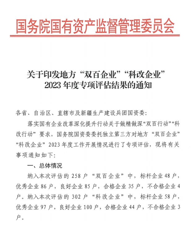據(jù)了解,“科改企業(yè)”專項(xiàng)評(píng)估每年進(jìn)行一次,旨在落實(shí)國有企業(yè)改革深化提升行動(dòng)關(guān)于做精做深“科改行動(dòng)”要求。本次國務(wù)院國資委委托獨(dú)立第三方對(duì)地方“科改企業(yè)”2023年度工作開展情況進(jìn)行了專項(xiàng)評(píng)估,考核結(jié)果按照得分高低分為標(biāo)桿、優(yōu)秀、良好、合格、不合格五個(gè)等級(jí),考核內(nèi)容涉及企業(yè)科技創(chuàng)新、體制機(jī)制、綜合成效等方面共計(jì)47項(xiàng)指標(biāo),全面權(quán)威地反應(yīng)了企業(yè)在加快科技新成果轉(zhuǎn)化、提升自主創(chuàng)新能力等方面的舉措和成果。