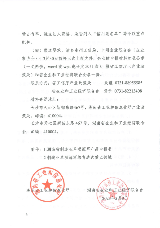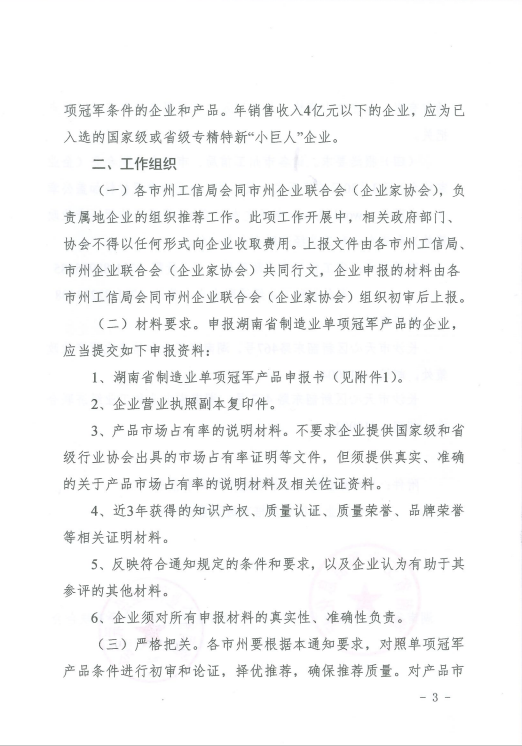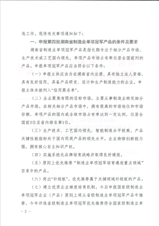 關(guān)于組織推薦第四批湖南省制造業(yè)單項(xiàng)冠軍產(chǎn)品的通知