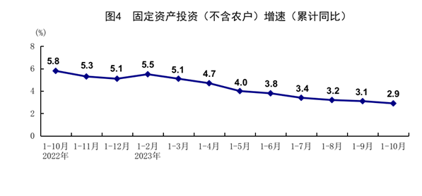 1-10月份,全國固定資產(chǎn)投資(不含農(nóng)戶)419409億元,同比增長2.9%,比1-9月份回落0.2個百分點。分領(lǐng)域看,基礎(chǔ)設(shè)施投資同比增長5.9%,制造業(yè)投資增長6.2%,房地產(chǎn)開發(fā)投資下降9.3%。全國商品房銷售面積92579萬平方米,同比下降7.8%;商品房銷售額97161億元,下降4.9%。分產(chǎn)業(yè)看,第一產(chǎn)業(yè)投資同比下降1.3%,第二產(chǎn)業(yè)投資增長9.0%,第三產(chǎn)業(yè)投資增長0.4%。民間投資下降0.5%,降幅比1-9月份收窄0.1個百分點;扣除房地產(chǎn)開發(fā)投資,民間投資同比增長9.1%。高技術(shù)產(chǎn)業(yè)投資同比增長11.1%,其中高技術(shù)制造業(yè)和高技術(shù)服務(wù)業(yè)投資分別增長11.3%、10.5%。高技術(shù)制造業(yè)中,航空、航天器及設(shè)備制造業(yè),醫(yī)療儀器設(shè)備及儀器儀表制造業(yè)投資分別增長19.0%、16.7%;高技術(shù)服務(wù)業(yè)中,科技成果轉(zhuǎn)化服務(wù)業(yè)、專業(yè)技術(shù)服務(wù)業(yè)投資分別增長37.3%、29.1%。10月份,固定資產(chǎn)投資(不含農(nóng)戶)環(huán)比增長0.10%。